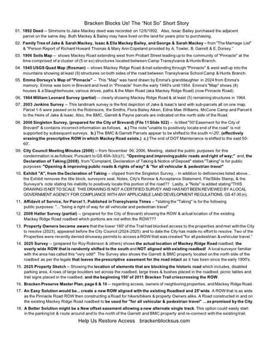 Pinnacle Road aka Mackey Ridge Road has served as a vital access route for generations, with historical records dating back to 1892 showing continuous use by families like the Mackeys and Baileys. Multiple surveys and maps—from 1906 through 2025—confirm the road’s existence and alignment, supporting its role as a longstanding public right-of-way. Despite this, a 2006 survey commissioned by the City of Brevard introduced inaccuracies that obscured the historic roadbed, leading to eventual obstruction of access. Boulders, trees, and signage now block the path, undermining the City’s original promise to preserve pedestrian and vehicular access for all.