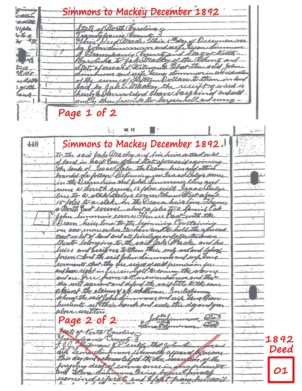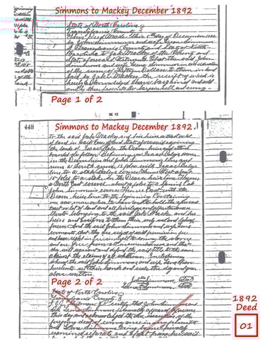 1892 Deed - Simmons to Jake Mackey deed recorded on December 6, 1892. Issac Bailey purchased the adjacent parcel on the same day. Both Mackey and Bailey may have lived on the land for several years prior to purchasing.