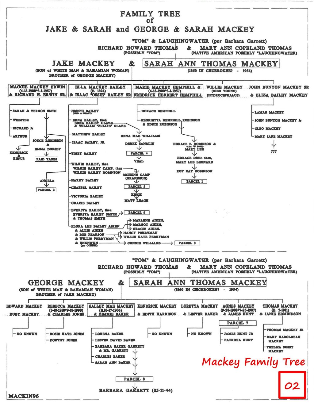 Family Tree of Jake & Sarah Mackey, Isaac & Ella Mackey Bailey, and George & Sarah Mackey - From “The Marriage List” and “Person Report of Richard Howard Thomas & Mary Ann Copeland provided by A. Towler, B. Garrett & E. Dorsey.”