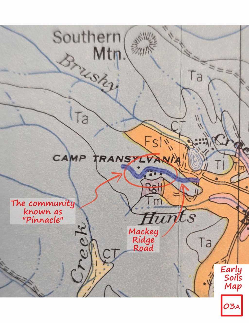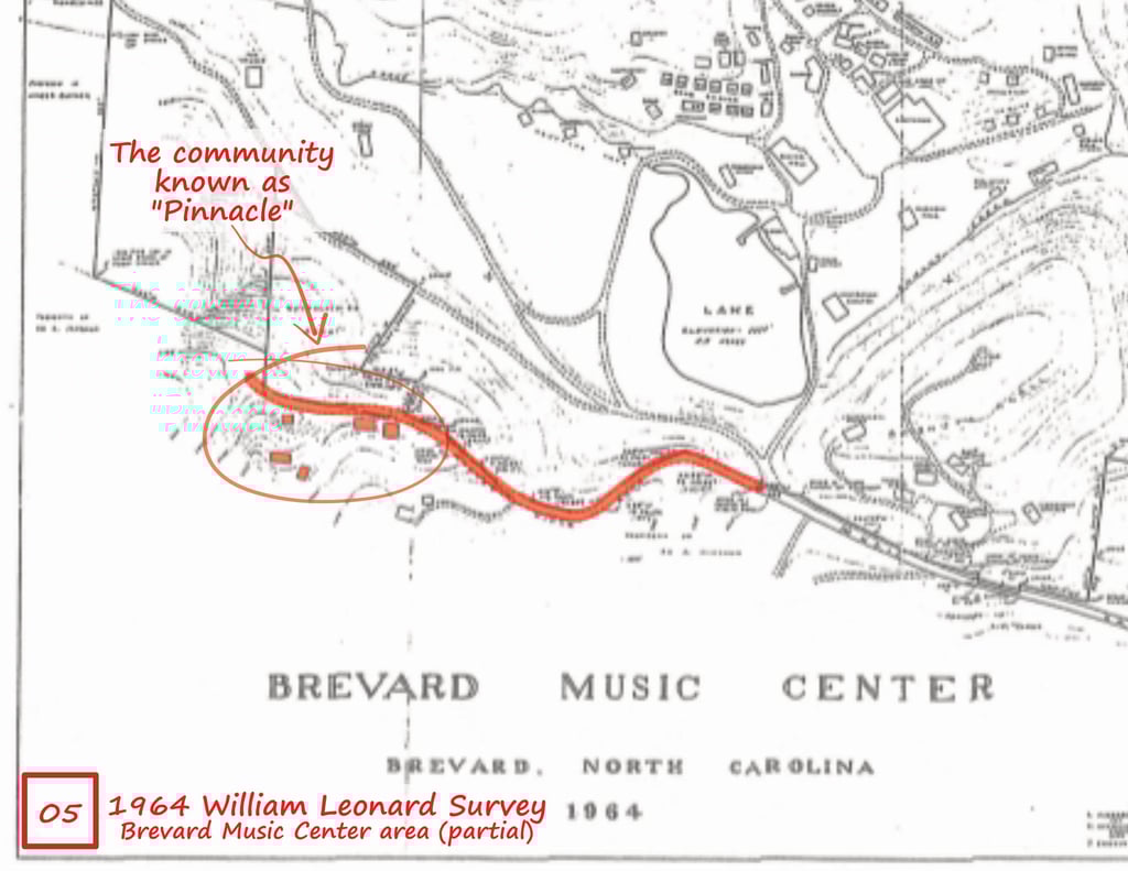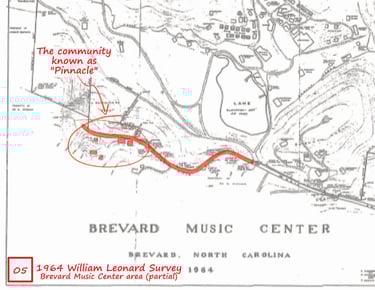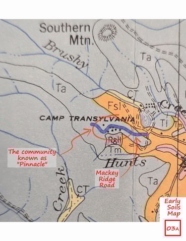 Early Maps - Both showing Mackey Ridge Road going west from Probart Street leading up to the community of “Pinnacle” comprised of a cluster of nine or ten structures located between Transylvania School Camp and Hunts Branch. The 1945 Quad Map shows Mackey Ridge Road and trail extending through “Pinnacle” and westward well up into the mountains.
