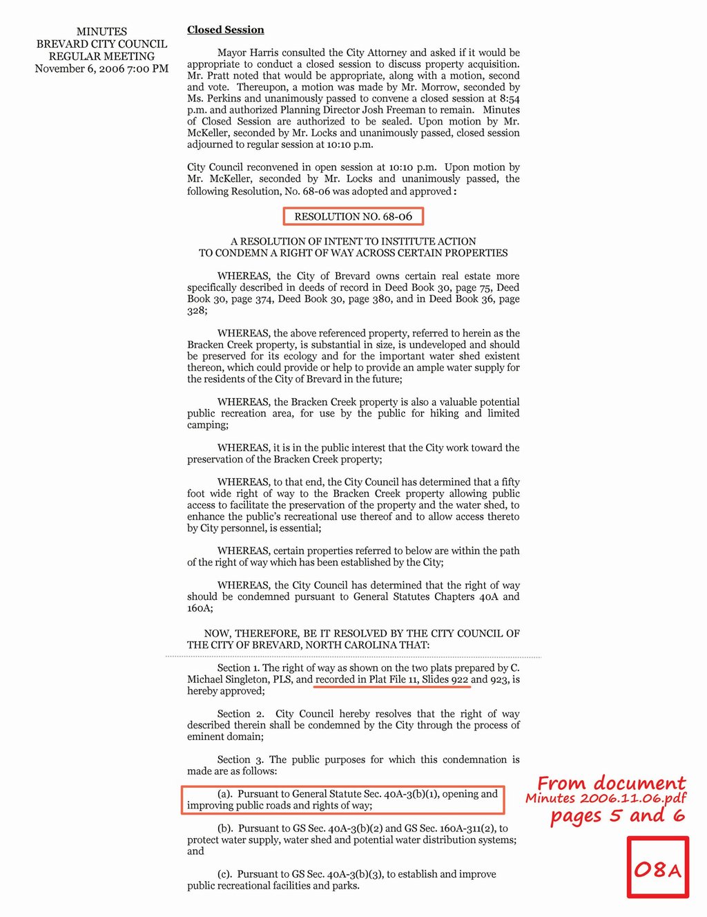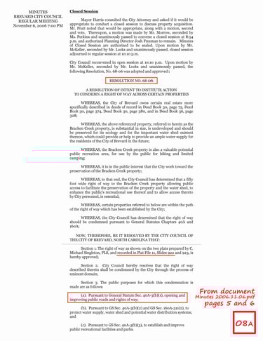 City Council Meeting Minutes (2006) and Declaration of Taking (2008)