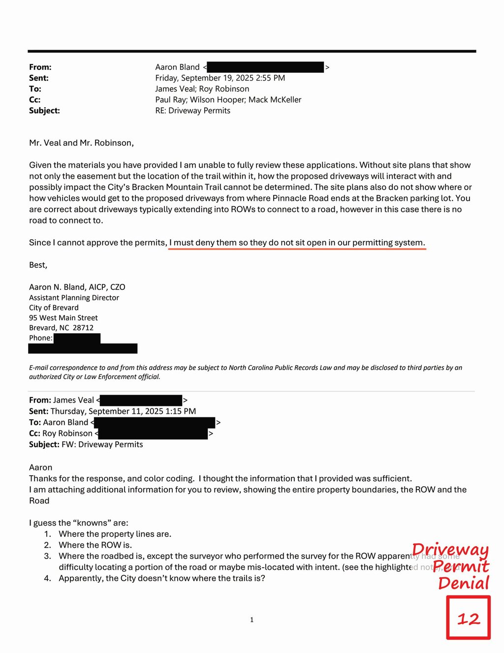Driveway Permit Denial - Property Owners became aware that the lower 220 feet of the Trail had blocked access to the properties and met with the City to resolve (2023.) They appeared before the City Council (2024-2025) and to date the City has made no effort to resolve this problem. Two of the Properties were recently denied driveway permits to access the public ROW that was created “for all pedestrian & vehicular travel.”