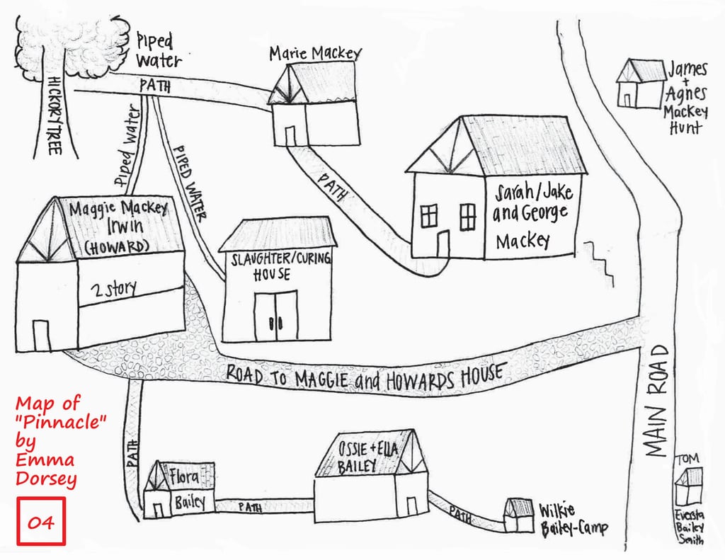 Emma Dorsey’s Map of “Pinnacle” - A “Map” hand drawn by Emma's granddaughter from Emma's memory. Emma lived in “Pinnacle” from 1939 until 1954. The “Map” shows nine structures, piping for water, drives, paths, and the main road.