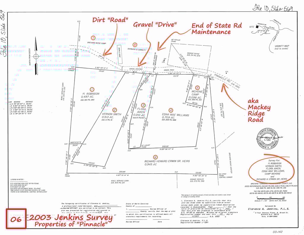 2003 Jenkins Survey - This survey shows the subdivision of Jake and Isaac's land being passed on to the Robinsons, Smiths, Flora Bailey Aiken, Edna Williams, Camp and Dorsey. The BMC and Garrett parcels are noted to the north.
