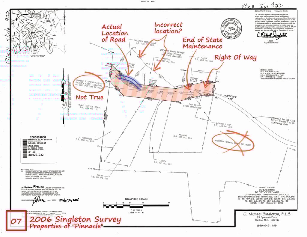 2006 Singleton Survey - prepared for the City of Brevard titled “50' EASEMENT TO CITY OF BREVARD” (File 11 Slide 922) and is believed to contain incorrect information as follows.