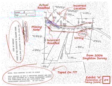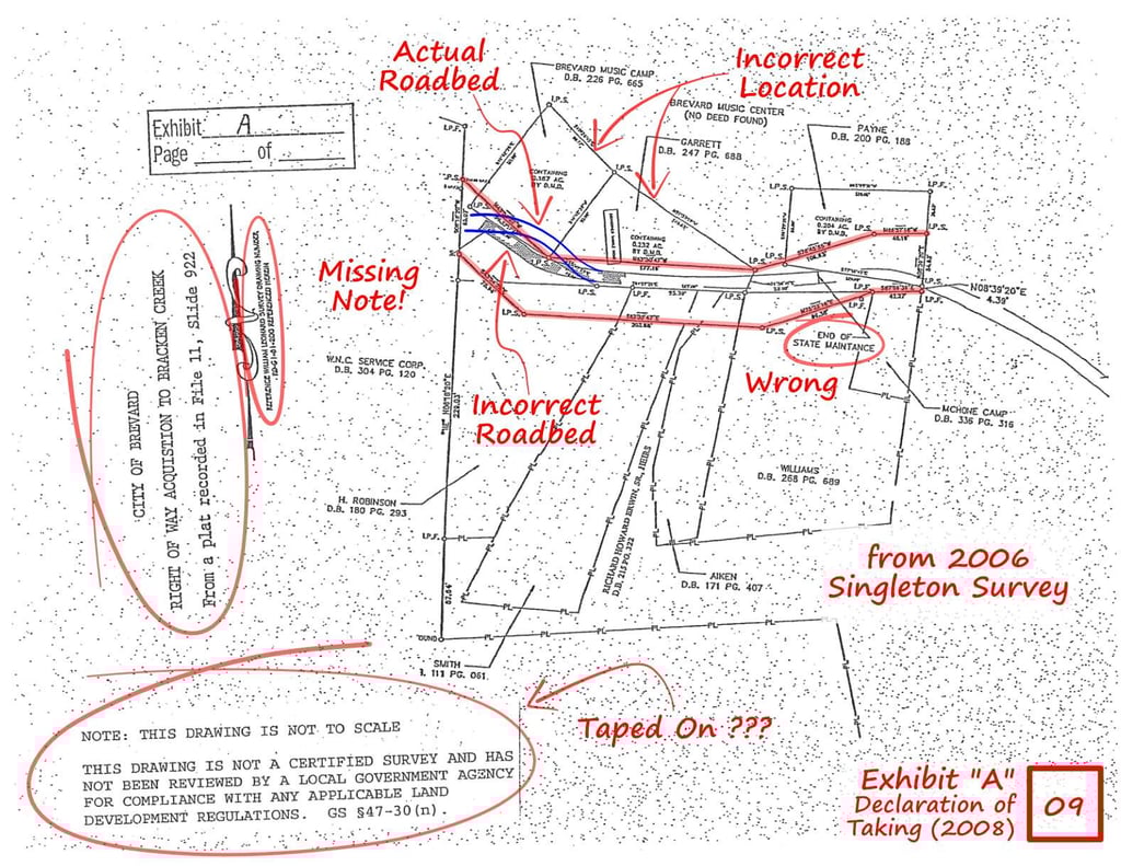 Exhibit “A”, from the Declaration of Taking - clipped from the Singleton Survey, in addition to deficiencies listed above, the Exhibit removes the title block, surveyors seal, Notes, City's Review & Acceptance Statement, File/Slide Stamp and the Surveyor's note stating his inability to positively locate this portion of the road. Lastly, a “Note” attached states “NOTE: THIS DRAWING IS NOT TO SCALE. THIS DRAWING IS NOT A CERTIFIED SURVEY AND HAS NOT BEEN REVIEWED BY A LOCAL GOVERNMENT AGENCY FOR COMPLIANCE WITH ANY APPLICABLE LAND DEVELOPMENT REGULATIONS. GS 47-30 (n).