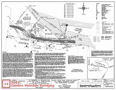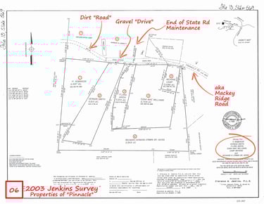 2025 Survey (prepared for Roy Robinson and others) - shows the actual location of the Mackey Ridge Road roadbed, the overly wide ROW that is shifted to the south and NOT aligned with the existing roadbed. A local surveyor familiar with the area has called this “very odd.” The survey also shows the Garrett and BMC property located on the north side of the roadbed as per the legals that leaves the prescriptive easement for the road intact as it has been since the early 1900's.
