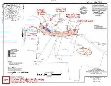 2006 Singleton Survey - prepared for the City of Brevard titled “50' EASEMENT TO CITY OF BREVARD” (File 11 Slide 922) and is believed to contain incorrect information as follows. a.) The note “unable to positively locate end of the road” is not supported by subsequent surveys. b.) The Brevard Music Center and Garrett Parcels appear to be shifted to the south by 20 – 25 feet, effectively erasing the prescriptive ROW in which Mackey Ridge Road exists. c.) The end of DOT Maintenance is shifted to the east 90 feet.