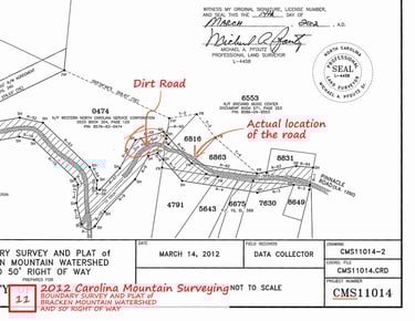 2012 CMS Survey (partial) - prepared for the City of Brevard titled “BOUNDARY SURVEY AND PLAT of BRACKEN MOUNTAIN WATERSHED AND 50' RIGHT OF WAY.” Shows the ROW and actual location of the Mackey Ridge Road roadbed, parts of which are not within the ROW, and the roadbed extending well past the affected properties.