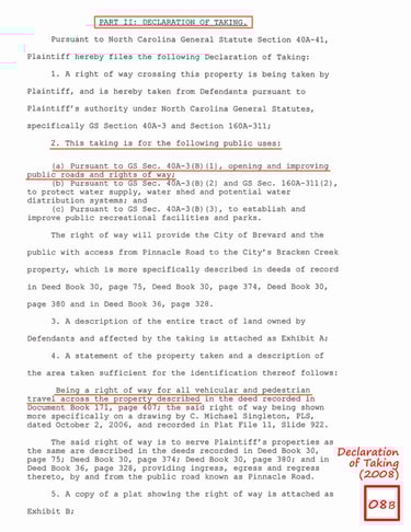 City Council Meeting Minutes (2006) and Declaration of Taking (2008) - From November 06, 2006 city council meeting, states the public purposes for this condemnation are; Pursuant to GS 40A-3(b)(1), “opening and improving public roads and rights of way;” and the Declaration of Taking (2008) states “This taking is for the following public uses” “opening and improving public roads and rights of way” and “for all vehicular and pedestrian travel”