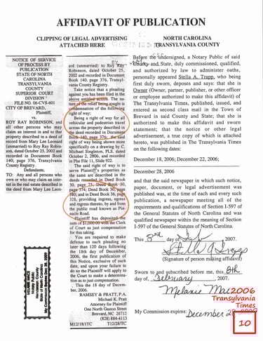 Affidavit of Publication, for Parcel 1, Published in the Transylvania Times - stating the “Taking” is for the following public purposes: “being a right of way for all vehicular and pedestrian travel” and “providing ingress, egress, and regress thereto, by and from the public road known as Pinnacle Road.”
